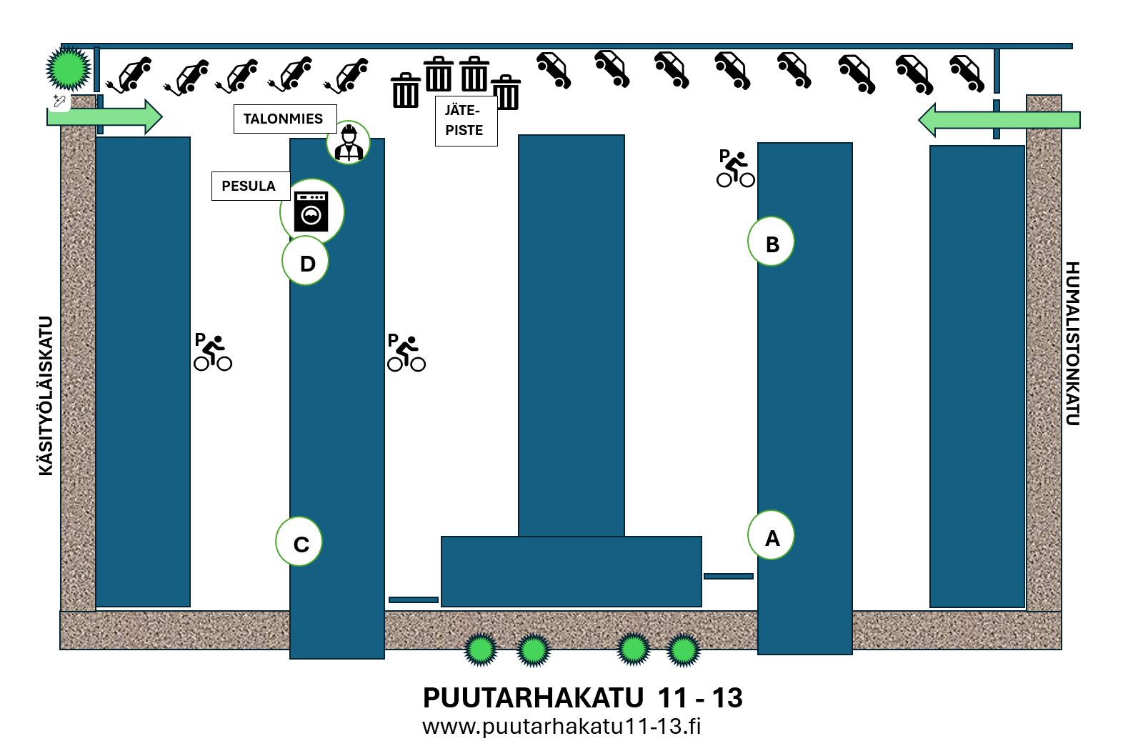 Pihallamme on 43 vuokrapaikkaa henkilöautoille, 5 MP-paikkaa, sekä 19 talliosaketta. Polkupyörille ja skuuteille on säilytystilaa sekä sisällä että ulkona.